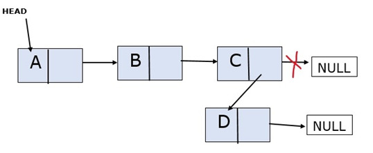 新節點新增到最後一個節點之後,並且新節點指向NULL。考慮一個包含3個節點A、B和C的連結串列。新節點D要新增到結尾。
