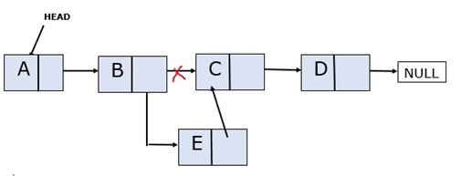 考慮一個包含4個節點A、B、C和D的連結串列。新節點E要插入到位置3(這意味著它新增到節點B之後)。