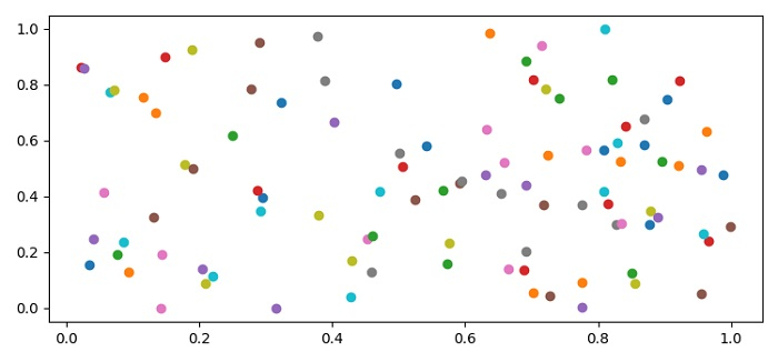 import numpy as np from matplotlib import pyplot as plt plt.rcParams["figure.figsize"] = [7.50, 3.50] plt.rcParams["figure.autolayout"] = True xs = np.random.rand(100) ys = np.random.rand(100) for x, y in zip(xs, ys): plt.scatter(x, y, cmap="copper") plt.show()