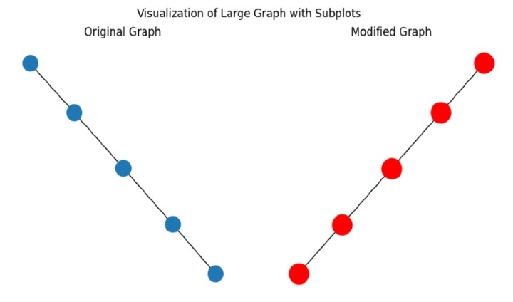 接下來是第二個子圖,我們重複此過程。我們設定其標題並使用索引 1 訪問它。我們還使用 NetworkX 中的 spring_layout() 函式計算節點位置,該函式以美觀的方式排列節點。然後,我們再次使用 draw() 函式在此子圖上視覺化修改後的圖形。在這裡,我們可以自定義節點顏色、大小和標籤,以將其與原始圖形區分開來。
