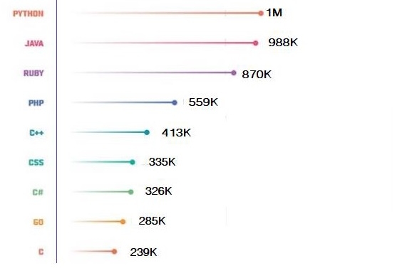 這兩種語言在開發者社群中都很受歡迎(這也是進行比較的原因之一)。以下是 2018 年 GitHub 上基於開啟的拉取請求排名前十的流行語言: