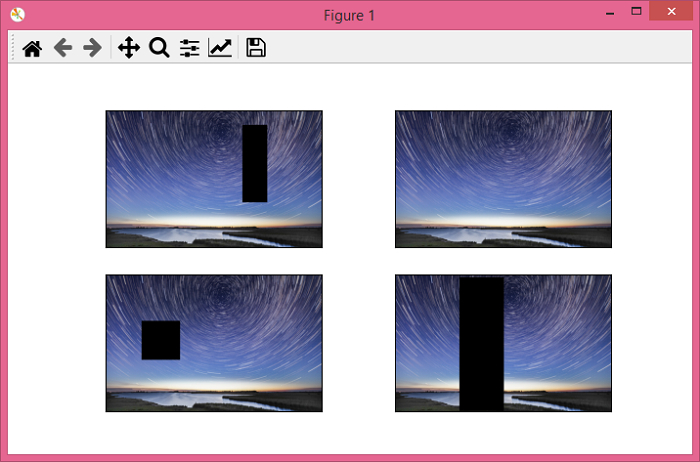 以下程式會從輸入影像中隨機選擇一個矩形區域並擦除其畫素。在這裡,我們將機率設定為 1,因此它一定會選擇影像中的一個區域並擦除其畫素。