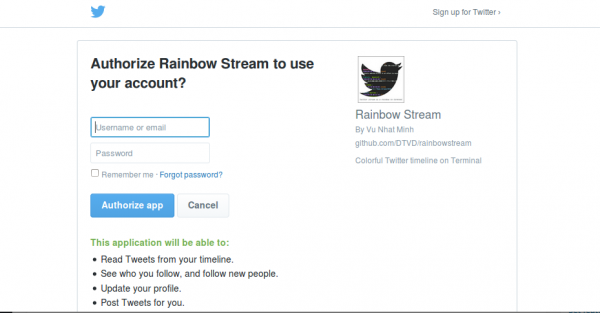 You are running latest version (1.3.3) Hi there! We're gonna get you all set up to use Rainbow Stream. In the web browser window that opens please choose to Allow access. Copy the PIN number that appears on the next page and paste or type it here: Opening: https://api.twitter.com/oauth/authorize?oauth_token=AB-78QAAAAAAXZ0wAAABVGBoQvQ Please enter the PIN: ******* That's it! Your authorization keys have been written to /root/.rainbow_oauth. _ _ _ _ _ ___________ _____ | | (_) | | | | ||___ / _ || _ | | | ___| |_| |_ _ _ _ __ _ __ __ _ ___ __ _ __| | / /| |/' || |/' | | |/ / | __| __| | | | '_ \| '__/ _` / __|/ _` |/ _` | / / | /| || /| | | <| | |_| |_| |_| | |_) | | | (_| \__ \ (_| | (_| |./ / \ |_/ /\ |_/ / |_|\_\_|\__|\__|\__,_| .__/|_| \__,_|___/\__,_|\__,_|\_/ \___/ \___/ | | |_| Need tips ? Type "h" and hit Enter key!