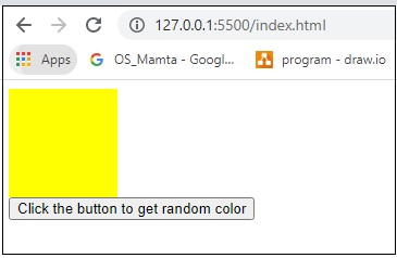 預設情況下,它會給出黃色,當你單擊該按鈕時,將顯示隨機顏色。以下是輸出 −
