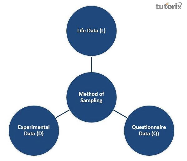 在心理學領域,雷蒙德·卡特爾做出了許多貢獻,但他最出名的是他的性格理論。卡特爾在研究人格時使用可量化的資料而不是觀察。他透過應用因素分析法來研究人格。他將資料分為三種類型,以獲得一種龐大而恰當的抽樣方法。這三種方法是