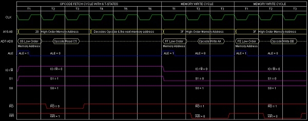 總結:因此,此指令PUSH B需要1個位元組、3個機器週期(操作碼獲取、記憶體寫入、記憶體寫入)和12個T狀態才能執行,如時序圖所示。