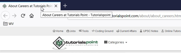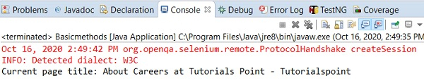 j.executeScript("return document.title")讓我們透過讀取來自 Javascript 變數的值以下頁面的瀏覽器標題。輸出應該是 關於tutorialspoint.com的職業 - Tutorialspoint.