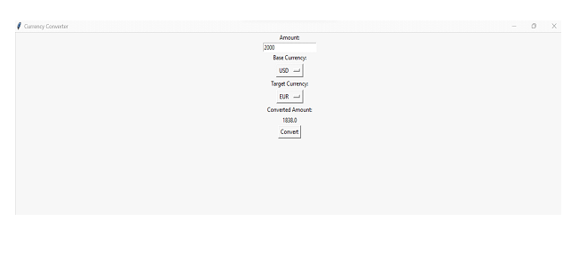 使用 Python Tkinter 進行即時貨幣轉換包括建立一個圖形使用者介面 (GUI) 應用程式,允許使用者即時轉換貨幣。該應用程式遵循一個逐步的過程,從使用者輸入要轉換的金額和選擇基礎和目標貨幣開始。為了獲取即時匯率,該應用程式與貨幣匯率 API 互動。這可以使用“requests”庫來完成,該庫允許對 API 端點發出 HTTP 請求。API 返回一個包含各種貨幣最新匯率的 JSON 響應。該應用程式從 API 響應中提取所選基礎貨幣和目標貨幣之間的轉換率。