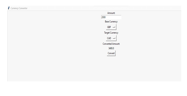 執行應用程式後,將出現一個 GUI 視窗,其中包含金額的輸入欄位、轉換金額的標籤和“轉換”按鈕。使用者可以在輸入欄位中輸入金額,然後單擊“轉換”按鈕以在結果標籤中檢視轉換後的金額。