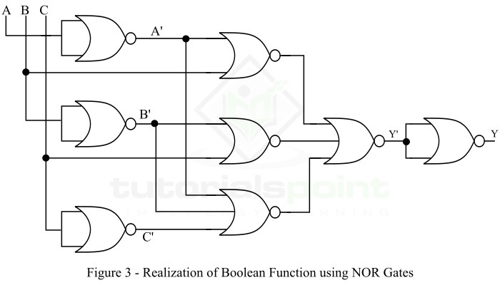 因此,我們已經討論了使用NOR門僅實現SOP形式的邏輯表示式的所有基本概念。現在,讓我們討論如何使用NOR門實現SOP形式的邏輯函式。