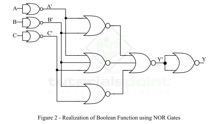 因此,這是可以使用NOR門實現的給定邏輯函式的形式。圖2顯示了使用NOR門實現此SOP形式的邏輯函式Y。