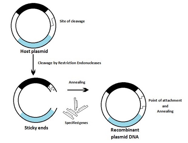 感興趣的載體和純化的DNA用相同的限制性內切酶切割。切割的載體和DNA片段現在是開放的。在連線過程中,DNA連線酶將這些片段連線起來形成重組DNA。
