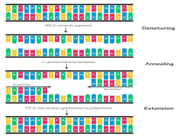 PCR或聚合酶鏈式反應是使用DNA聚合酶酶的DNA序列複製方法。在PCR反應中,組分包括引物、酶、核苷酸和模板。模板是指用於簡化的DNA,DNA聚合酶是所涉及的酶。引物是DNA區域的小型化學合成的寡核苷酸。核苷酸是酶延伸引物所需的。
