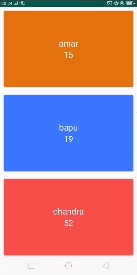 <?xml version = "1.0" encoding = "utf-8"?> <android.support.v7.widget.CardView xmlns:android = "http://schemas.android.com/apk/res/android" xmlns:card_view = "http://schemas.android.com/apk/res-auto" android:layout_width = "match_parent" card_view:cardCornerRadius = "4dp" android:id = "@+id/card_view" android:layout_margin = "10dp" android:layout_height = "200dp"> <LinearLayout android:id = "@+id/parent" android:layout_gravity = "center" android:layout_width = "match_parent" android:orientation = "vertical" android:gravity = "center" android:layout_height = "match_parent"> <TextView android:id = "@+id/name" android:layout_width = "wrap_content" android:gravity = "center" android:textSize = "25sp" android:textColor = "#FFF" android:layout_height = "wrap_content" /> <TextView android:id = "@+id/age" android:layout_width = "wrap_content" android:gravity = "center" android:textSize = "25sp" android:textColor = "#FFF" android:layout_height = "wrap_content" /> </LinearLayout> </android.support.v7.widget.CardView>