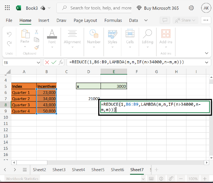 在 E8 單元格中寫入公式 **=REDUCE(1,B6:B9,LAMBDA(m,n,IF(n>34000,n-m,m)))**,如下面的圖片所示。