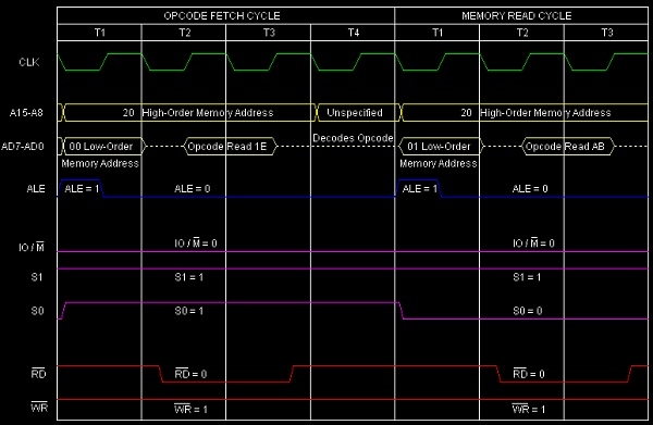 **總結** - 因此,此指令 **MVI E,ABH** 需要 2 個位元組、2 個機器週期(操作碼獲取和記憶體讀取)和 7 個 T 狀態才能執行,如時序圖所示。