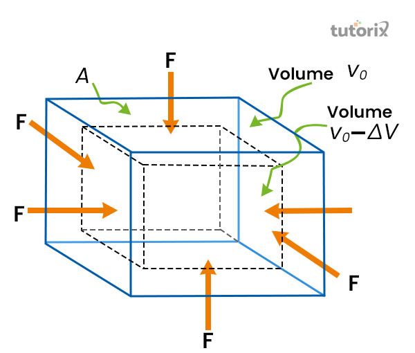當物體受到垂直方向的均勻壓力併產生正應力時,應力與應變的比率保持恆定。根據該定律,彈性常數的定義是正應力與相應的體積應變之比保持恆定。“體積模量”用字母“K”表示。可以使用以下公式計算體積模量: