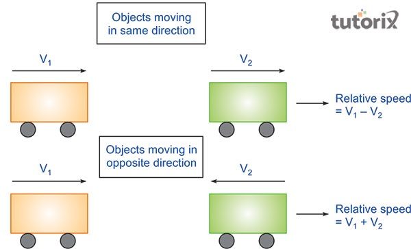 例如,如果第一個物體的速度為 x km/h,第二個物體的速度為 y km/h,那麼這裡物體的相對速度將是 ${(x\: -\: y) \:km/h\: [x \:\gt\: y]}$