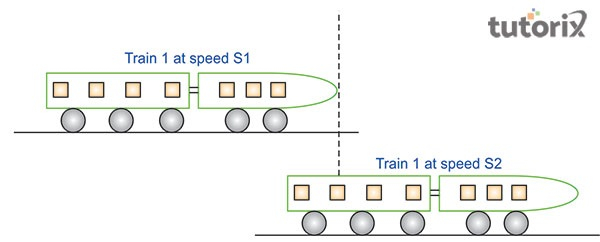 這裡,覆蓋的距離彼此成正比。例如,在上圖中,兩列火車(S1 和 S2)沿相同方向以相同的速度行駛。因此,當這兩列火車在某一點相遇時,它們到達相遇點的時間應該相同。