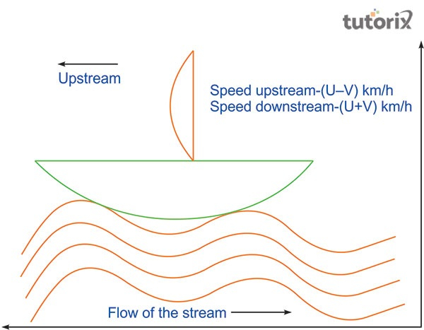根據上圖,當船逆水流方向行駛時,它向上遊行駛,然後它順水流方向行駛,它停在下游。基於這兩種情況,船的相對速度不同。為了計算上游,應用 $(u \:- \:v) \:km/h$,而對於下游,公式為 $(u \:+\: v)\: km/h$(Physicstutorials,2022)。