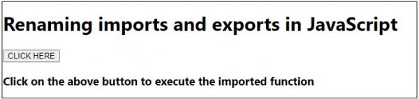 <!DOCTYPE html> <html lang="en"> <head> <meta charset="UTF-8" /> <meta name="viewport" content="width=device-width, initial-scale=1.0" /> <title>Document</title> <style> body { font-family: "Segoe UI", Tahoma, Geneva, Verdana, sans-serif; } .result { font-size: 18px; font-weight: 500; color: rebeccapurple; } </style> </head> <body> <h1>Renaming imports and exports in JavaScript</h1> <div class="result"></div> <button class="Btn">CLICK HERE</button> <h3>Click on the above button to execute the imported function</h3> <script src="script.js" type="module"></script> </body> </html>