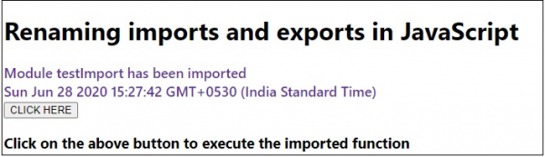 import {test,tellTime as showTime} from "./sample.js"; let resultEle = document.querySelector('.result'); document.querySelector('.Btn').addEventListener('click',()=>{ resultEle.innerHTML+=test(); resultEle.innerHTML+=showTime(); })