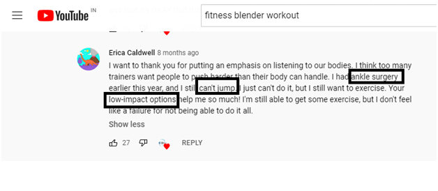 當我檢視健身攪拌機影片的評論部分時,我在這裡發現了三個主要關鍵字——踝關節手術、低衝擊力鍛鍊、無法跳躍。考慮到這三個關鍵字,我可以製作一個關於低衝擊力鍛鍊的新影片,該影片可以燃燒卡路里,但不包括跳躍。