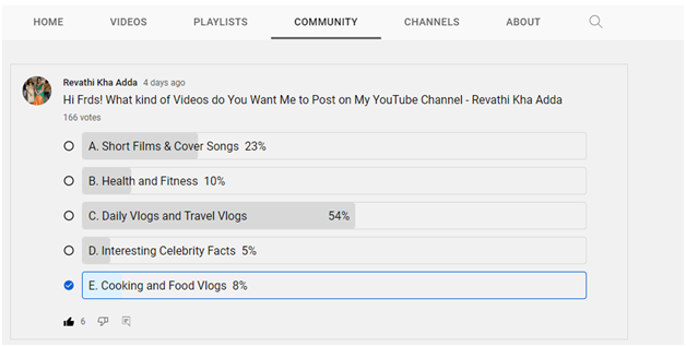 例如,在我的“社群”選項卡中,我詢問我的觀眾希望我在我的 YouTube 頻道上釋出哪種型別的影片,並且我也給了他們一些選項,大多數人建議我應該製作關於日常影片部落格和旅行影片部落格的影片。因此,現在我有了主意,我開始製作關於日常影片部落格和旅行影片部落格的影片。