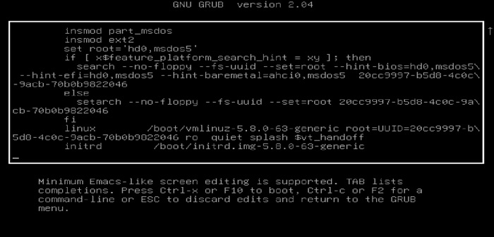 使用方向鍵,向下移動到以“Linux /boot/vmlinuz,”開頭的行,您需要將“ro quiet splash $vt_handoff”替換為“rw init=/bin/bash”。