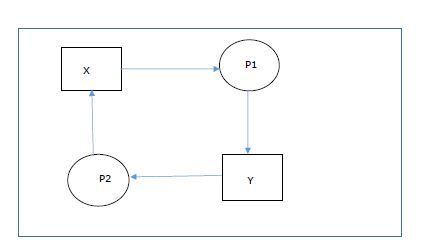 資源死鎖發生在當一個程序等待由另一個程序持有一組資源,並且它等待在解除阻塞之前接收所有請求的資源時。因此,等待資源的程序集被稱為處於資源死鎖狀態。考慮一個例子,當兩個程序 P1 和 P2 需要資源 X 和 Y 時。在這種情況下,P1 等待資源 Y,而 P2 持有資源 Y,而 P2 反過來等待資源 X,該資源必須由持有它的 P1 釋放。因此,在