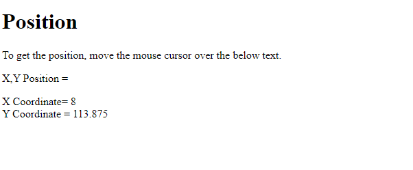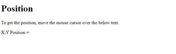 <!DOCTYPE html> <html> <head> <title>Example X,Y Coordinate</title> <script> function getPositionXY(element) { var rect = element.getBoundingClientRect(); document.getElementById('text').innerHTML = 'X Coordinate= ' + rect.x + '<br>' + 'Y Coordinate = ' + rect.y; } </script> </head> <body> <h1>Position</h1> <p>To get the position, move the mouse cursor over the below text.</p> <div onmouseover="getPositionXY(this)"> X,Y Position = <p id='text'></p> </div> </body> </html>