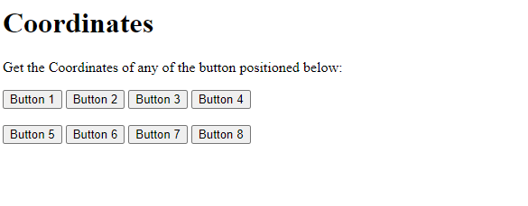 <!DOCTYPE html> <html> <head> <title>Coordinates of Buttons</title> <script> function getPositionXY(element) { var rect = element.getBoundingClientRect(); document.getElementById('demo').innerHTML = 'X Coordinates = ' + rect.x + ', ' + 'Y Coordinates = ' + rect.y } </script> </head> <body> <h1>Coordinates</h1> <p>Get the Coordinates of any of the button positioned below:</p> <button id='button1' onclick="getPositionXY(this)">Button 1</button> <button id='button1' onclick="getPositionXY(this)">Button 2</button> <button id='button1' onclick="getPositionXY(this)">Button 3</button> <button id='button1' onclick="getPositionXY(this)">Button 4</button> <br><br> <button id='button1' onclick="getPositionXY(this)">Button 5</button> <button id='button1' onclick="getPositionXY(this)">Button 6</button> <button id='button1' onclick="getPositionXY(this)">Button 7</button> <button id='button1' onclick="getPositionXY(this)">Button 8</button> <p id='demo'></p> </body> </html>