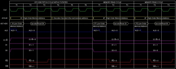 總結 − 因此,此指令RC需要1個位元組,3個機器週期(操作碼提取、記憶體讀取、記憶體讀取)和12個T狀態來執行,如時序圖所示。