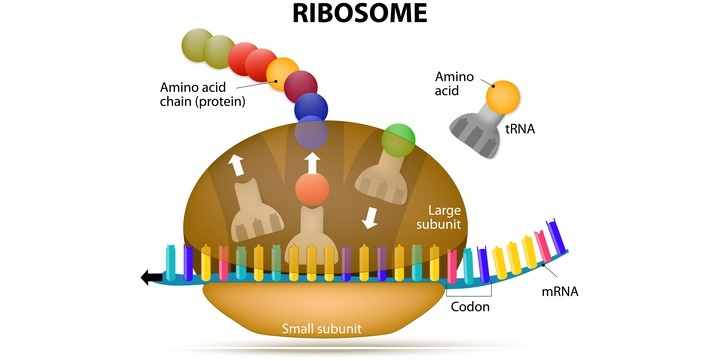 核糖體是細胞中蛋白質合成的場所,信使RNA (mRNA) 中編碼的資訊在此被翻譯成蛋白質的氨基酸序列。