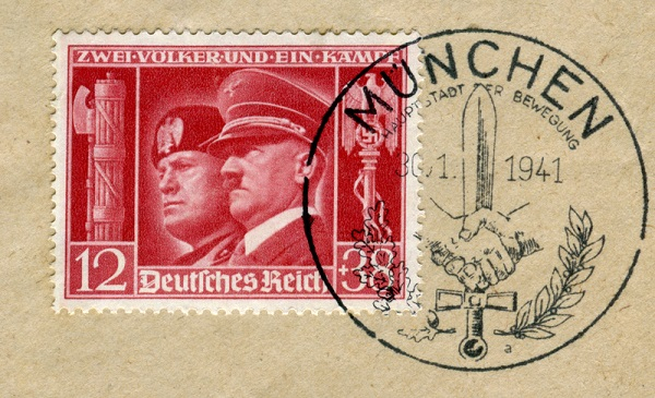 描述-希特勒和墨索里尼的肖像,以及納粹和法西斯政權的象徵