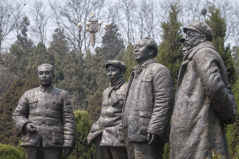 照片展示了位於西柏坡的中國共產黨五位主要領導人(毛澤東、朱德、劉少奇、周恩來、任弼時)的雕像。中國石家莊河北西柏坡,2013年4月16日。