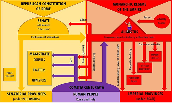 奧古斯都成為帝國的唯一權威和權力,但出於對元老院的尊重,他只宣稱自己是首席公民。在古羅馬,元老院擁有所有權力,但在奧古斯都統治之後,元老院的地位變得次要。元首制是一種政府形式,它結合了共和國和君主制。儘管權力掌握在奧古斯都手中。奧古斯都和他的繼任者保持了舊共和國的語言和傳統,以證明他們的權力是合理的。皇帝們開始建造巨大的紀念碑和建築物,這些建築物逐漸改變了羅馬城。
