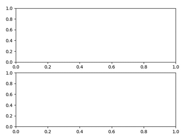 from matplotlib import pyplot as plt row_count = 2 col_count = 1 index1 = 1 # no. of subplots are: row*col, index is the position of figure. plt.subplot(row_count, col_count, index1) index2 = 2 plt.subplot(row_count, col_count, index2) plt.show()
