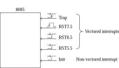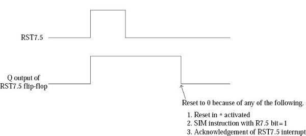 RST7.5 引腳是一個邊緣敏感輸入。外設使用它傳送脈衝,而不是持續高電平,以中斷處理器。8085 內部有一個觸發器,它連線到中斷引腳 RST7.5。在輸入 RST 7.5 上出現上升沿時,我們將此觸發器設定為 1。圖中顯示了引腳 RST7.5 和 RST7.5 觸發器輸出 Q 的波形。
