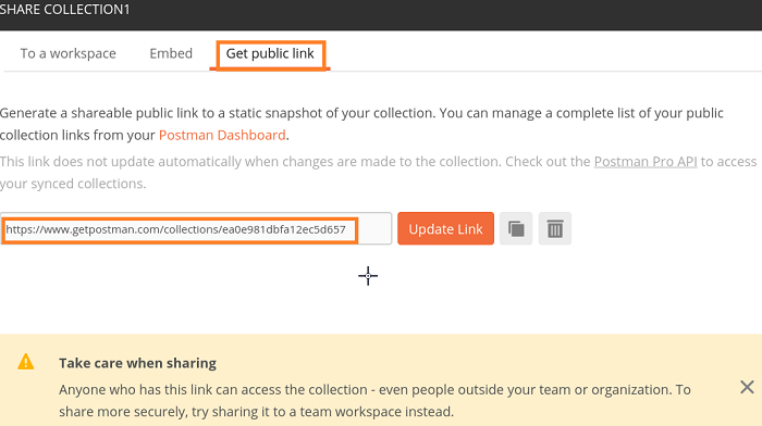 步驟 2 − “共享集合 1” 對話方塊將開啟。點選“獲取公共連結”選項卡,然後複製下圖中突出顯示的連結。
