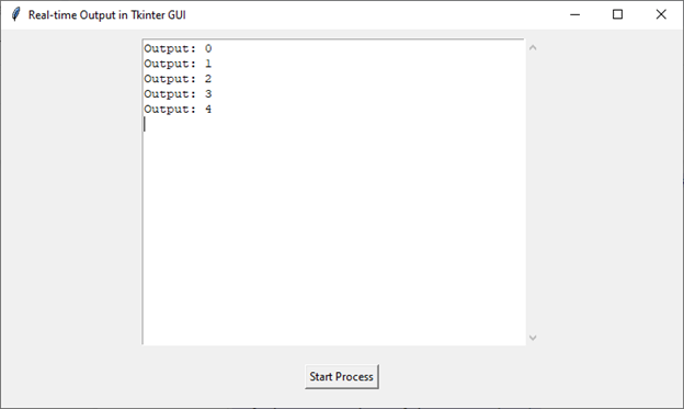 讓我們逐步介紹一個簡單的示例,以演示在 Tkinter GUI 中執行具有即時輸出的程序。在本例中,我們將使用一個基本場景,其中命令列程序生成連續輸出。