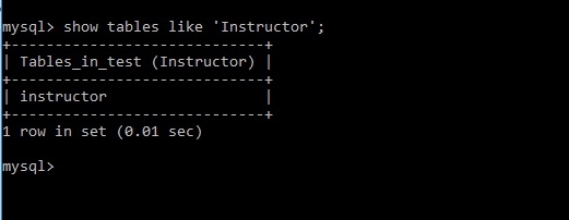 現在,檢查資料庫 test 中是否存在表“Instructor”。查詢如下