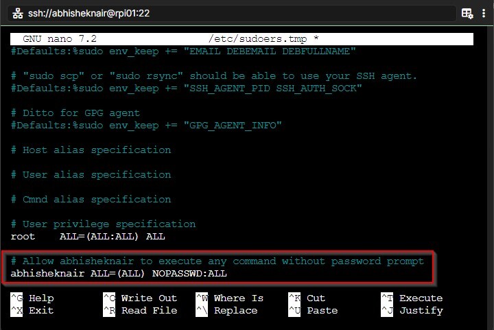 $ sudo cat /etc/sudoers.d/90-abhisheknair abhisheknair ALL=(ALL) NOPASSWD:ALL $
