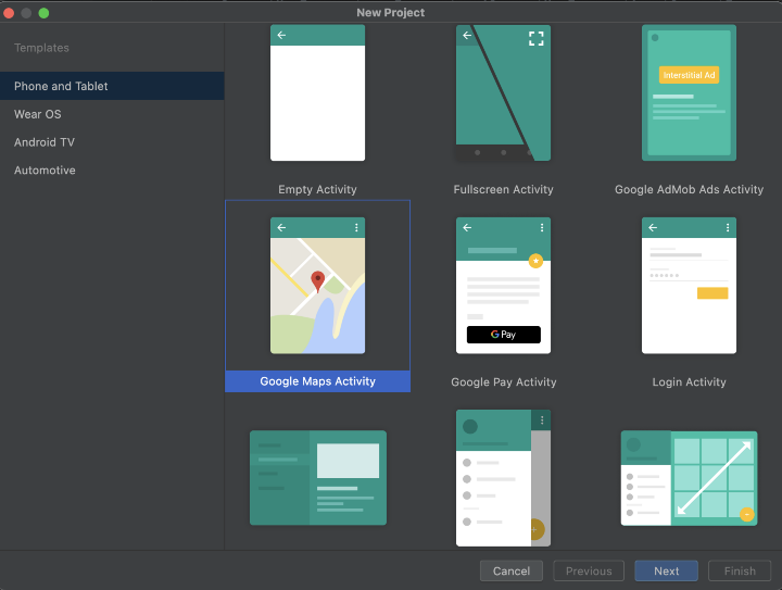 在這個螢幕中,我們只需選擇Google Maps Activity並單擊“下一步”。單擊“下一步”後,您將看到下面的螢幕。