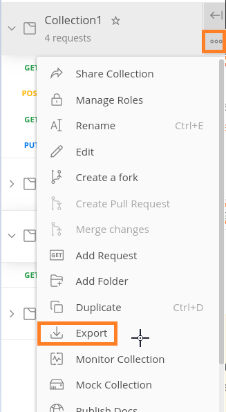 步驟 1 − 單擊集合名稱右側的三個點。然後單擊匯出按鈕。