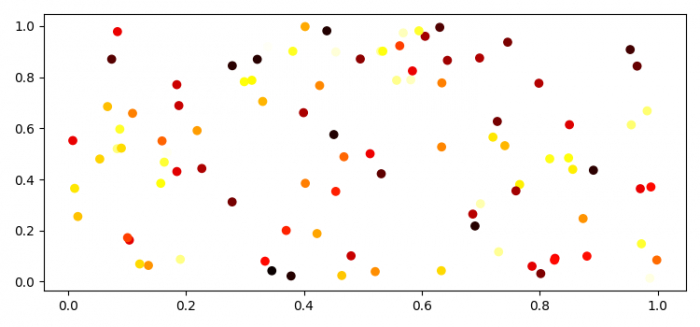 import numpy as np from matplotlib import pyplot as plt # Set the figure size plt.rcParams["figure.figsize"] = [7.50, 3.50] plt.rcParams["figure.autolayout"] = True # Random data of 100×3 dimension data = np.array(np.random.random((100, 3))) # Scatter plot plt.scatter(data[:, 0], data[:, 1], c=data[:, 2], cmap='hot') # Display the plot plt.show()