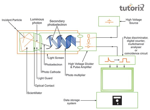 A2. 閃爍計數器的優點是它具有更高的靈敏度、高精度和效率。此處可以實現計數率,並且閃光持續時間短,大約為 10-9(有機閃爍體)至 10-6(無機閃爍體)秒。