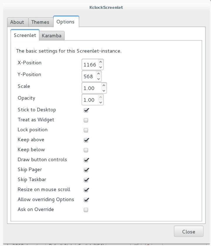 配置個人Screenlets − 在Screenlets管理器中,您可以自定義特定Screenlets。更改其在桌面上的位置,根據您的喜好調整其大小,控制其透明度,並配置選項,例如將其固定到桌面、鎖定其位置以及將其保持在其他視窗之上或之下。