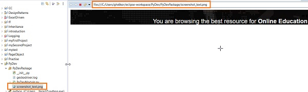 在識別元素之後,我們可以藉助 screenshot 方法捕獲其螢幕截圖。我們必須將螢幕截圖將儲存到的檔名(連同字尾)作為引數傳遞給此方法