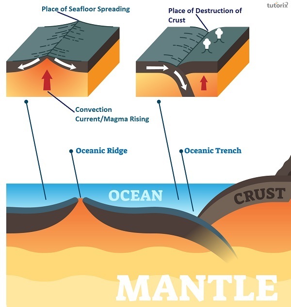 如上所述,海底擴張過程始於洋中脊,這一過程的發生是由於過熱和熔化的地幔透過對流(熱量)不斷加熱洋殼底部。由於持續且過度的加熱,地殼變得更具塑性,密度更低。對流進一步加熱並迫使密度較低的區域向上;因此,該區域上升並形成一個寬闊的穹頂。